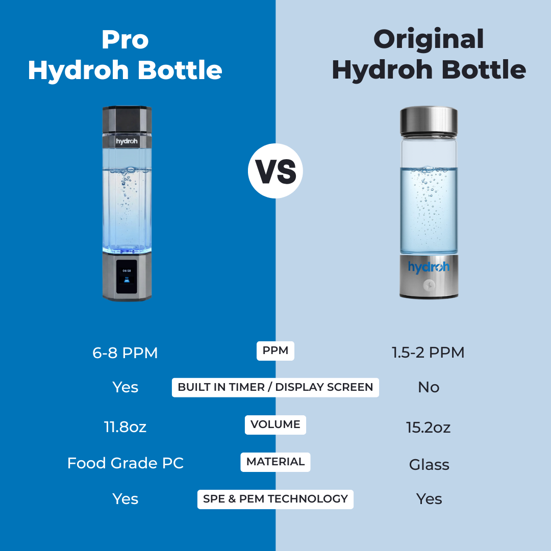 The Pro Bottle is for those who want the highest hydrogen concentration, advanced tech features like a built-in timer and display, and premium materials — designed for serious wellness enthusiasts. The Original is ideal for everyday users looking to experience the benefits of hydrogen water in a simple, reliable way.
