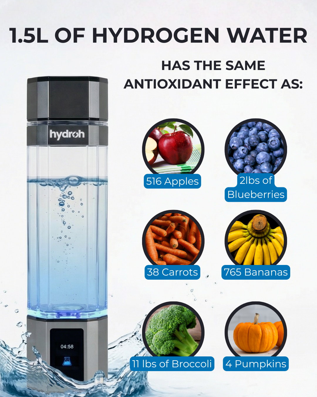 Clinical trials have even demonstrated that drinking three bottles of hydrogen water can provide antioxidant benefits equivalent to hundreds of fruits and vegetables.